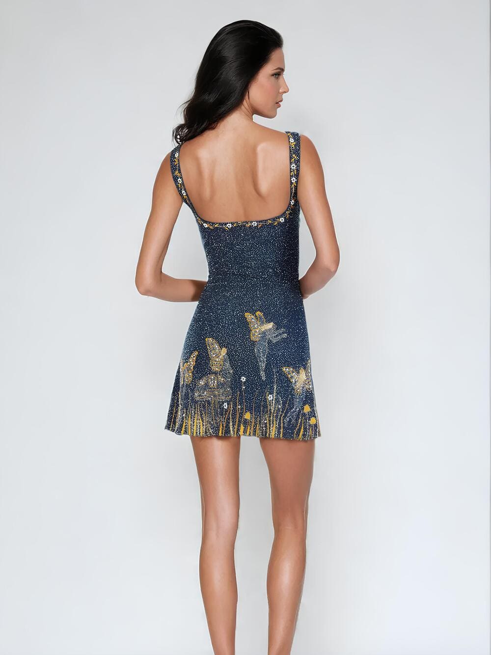 Vestido Curto Azul com Brilho e Estampa de Borboletas