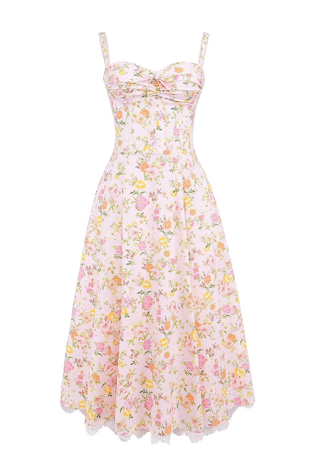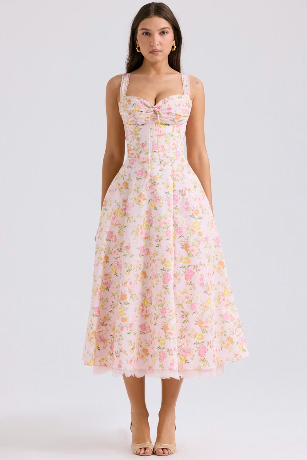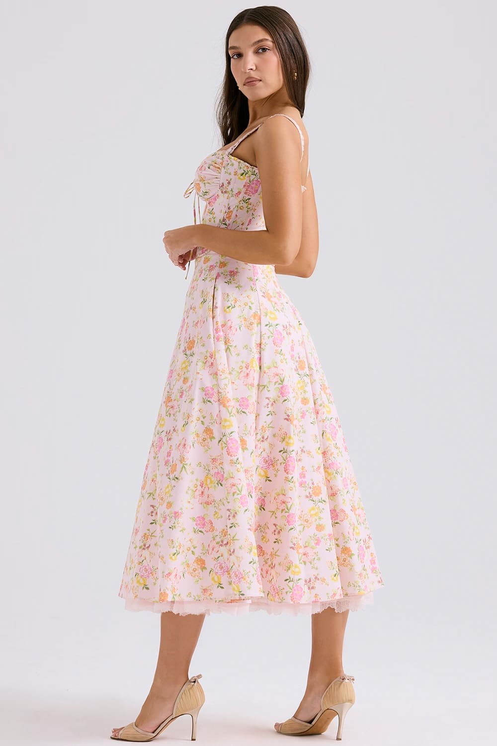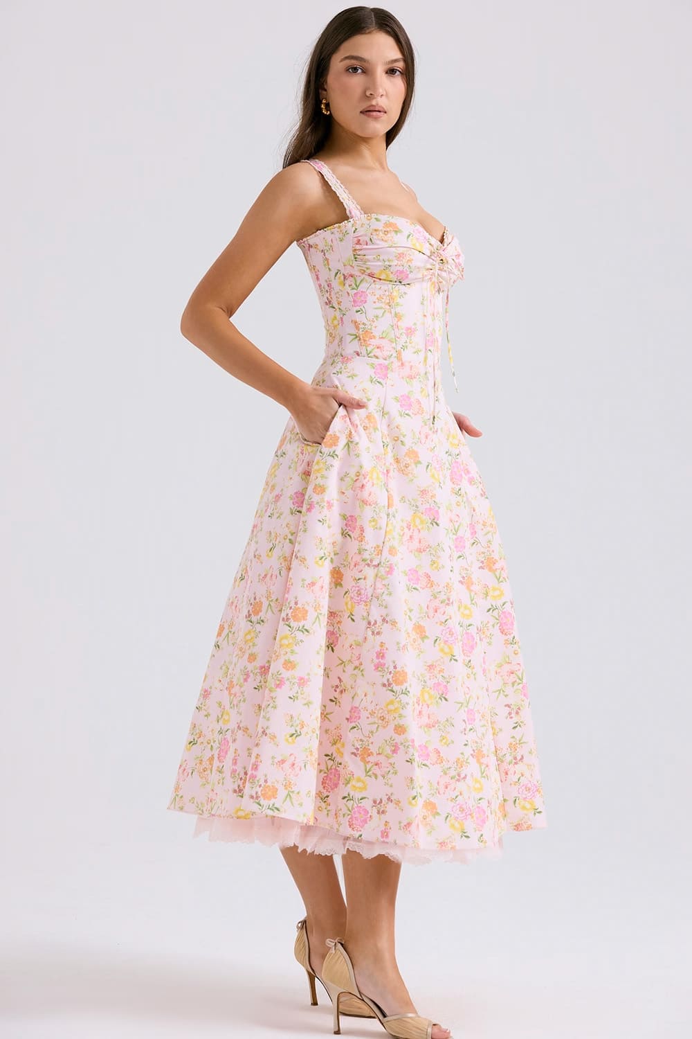 Encante com nosso romântico vestido godê midi rosa floral estampado com flores multicoloridas que exala feminilidade pura. O corpete ajustado com decote princesa e alças estruturadas valoriza o busto, enquanto a cintura marcada cria uma silhueta ampulheta perfeita.