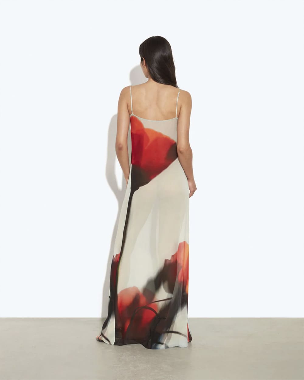 Exclusivo vestido longo com estampa artística aquarela que transforma cada peça em uma obra de arte única. Este modelo apresenta um design contemporâneo com base branca e manchas abstratas em tons de vermelho, laranja e preto que criam um efeito visual impactante e moderno. A estampa fluida e orgânica lembra pinceladas de tinta, conferindo personalidade e sofisticação ao look.