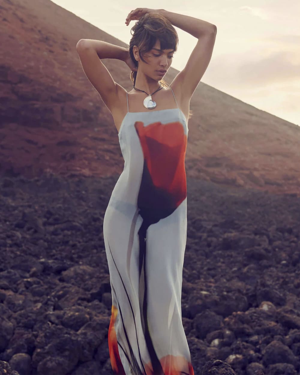 A combinação de cores permite versatilidade nos acessórios – aposte em peças douradas para aquecer o look ou escolha acessórios em tons terrosos para harmonizar com a paleta da estampa. Sandálias rasteiras para um visual boho-chic ou saltos para maior elegância completam perfeitamente a produção.