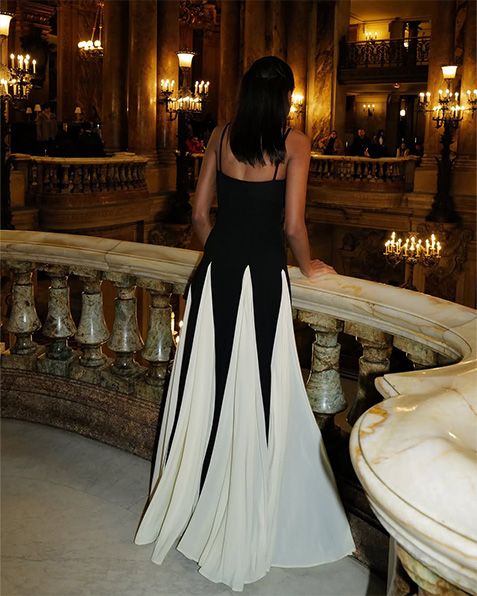 Meticulosamente trabalhado, cada painel é cortado individualmente e posicionado precisamente para criar o impressionante intercâmbio de luz e sombra. O corpete ajustado esculpe e eleva, enquanto os painéis fluidos da saia se liberam em uma exibição teatral de harmonia monocromática.