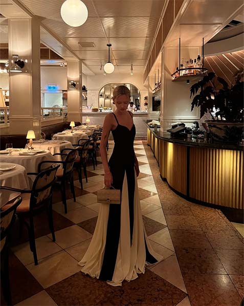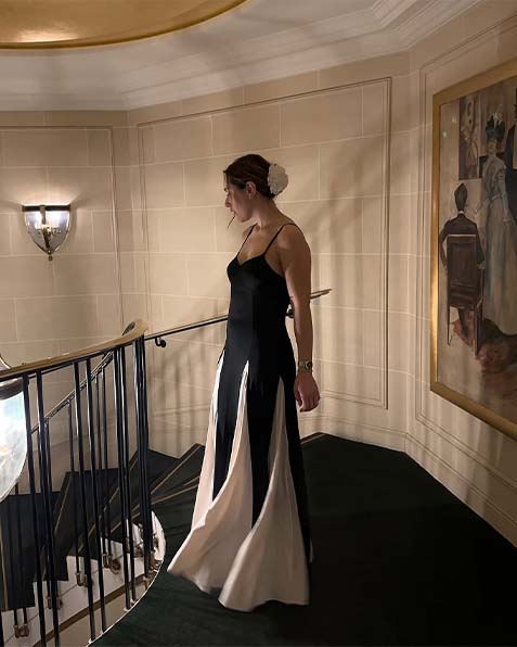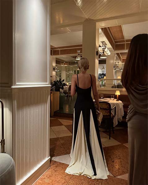 O epítome da elegância moderna, esta obra-prima redefine o traje de noite com seu contraste ousado de noir e marfim. Um corpete preto elegante com delicadas alças finas cria uma tela para o floreio dramático abaixo — painéis alternados de preto meia-noite e branco imaculado em cascata da silhueta ajustada, criando um movimento hipnotizante a cada passo.