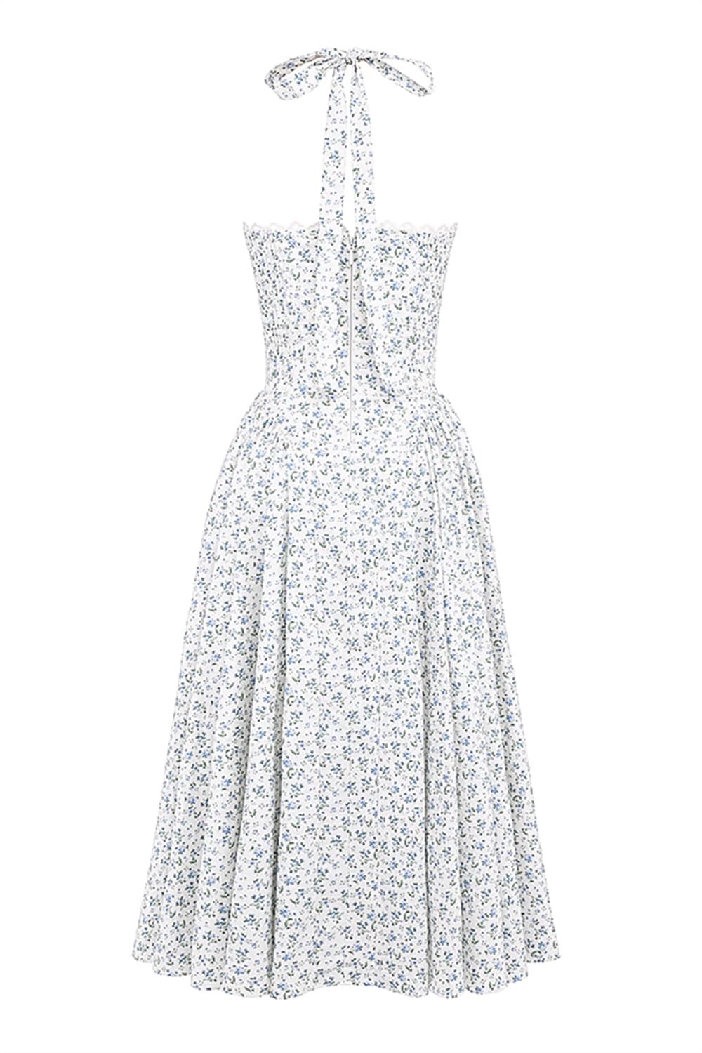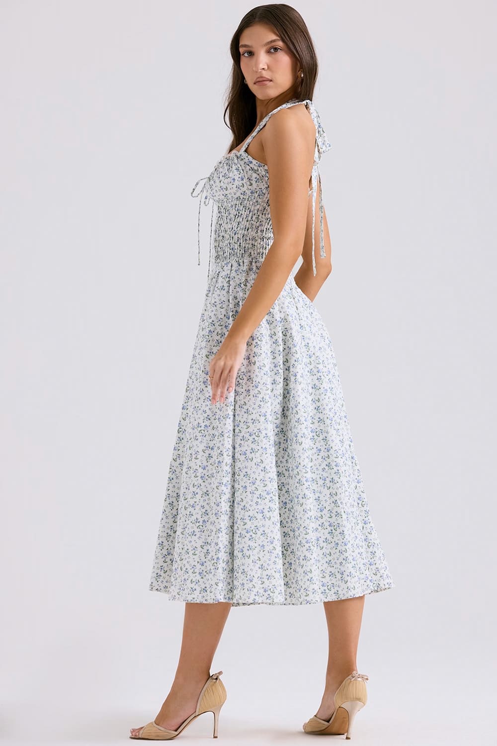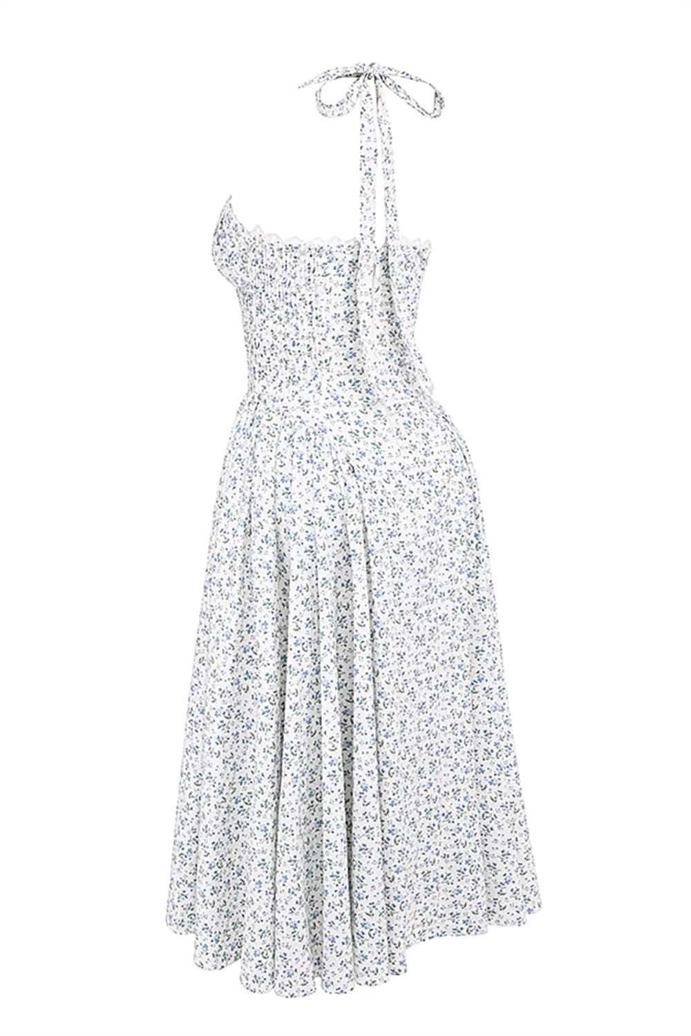 Desperte sua elegância mais delicada com nosso vestido midi azul floral com detalhes no busto e alças largas. O design atemporal apresenta micro estampa floral sobre fundo branco, criando uma peça versátil e sofisticada para mulheres que valorizam o romantismo clássico.