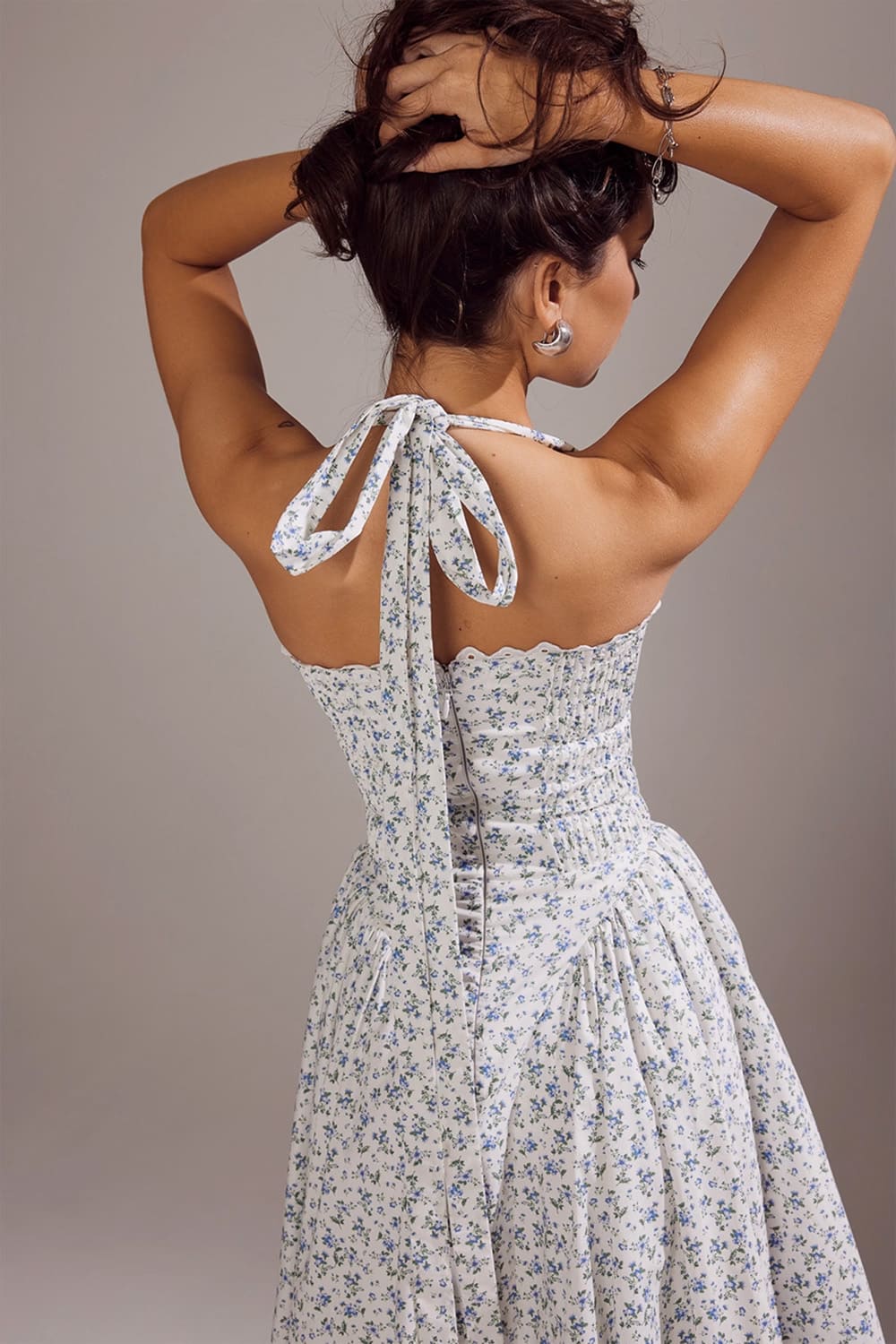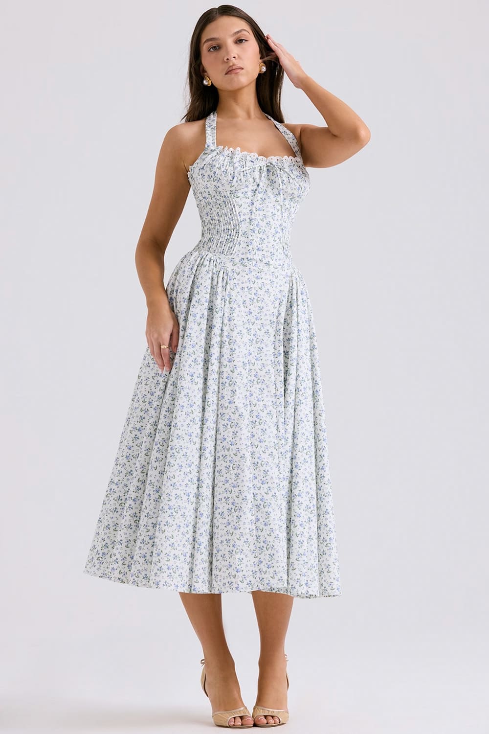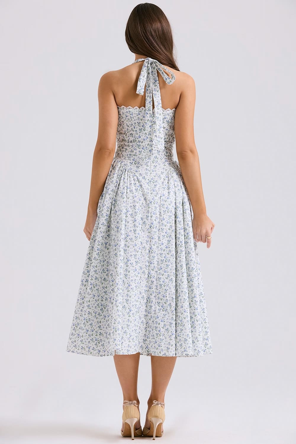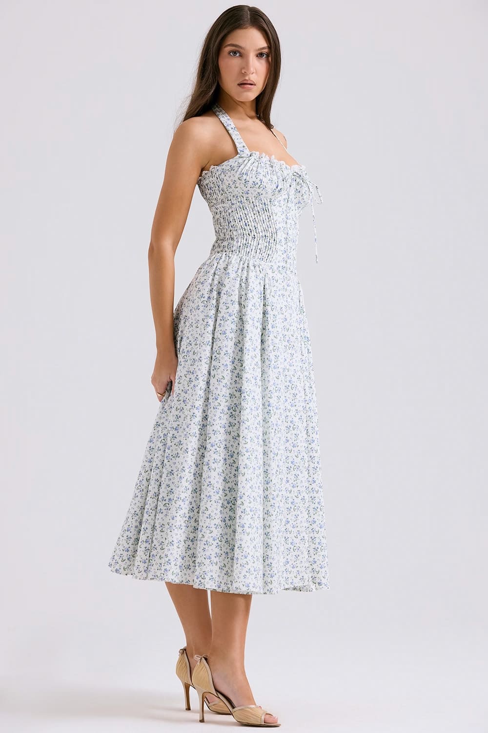 Desperte sua elegância mais delicada com nosso vestido midi azul floral com detalhes no busto e alças largas. O design atemporal apresenta micro estampa floral sobre fundo branco, criando uma peça versátil e sofisticada para mulheres que valorizam o romantismo clássico.