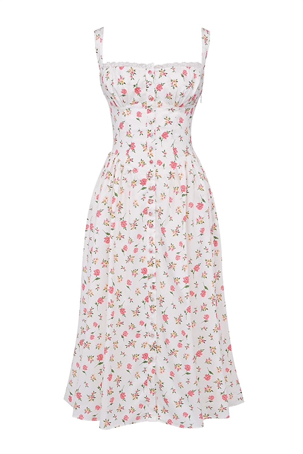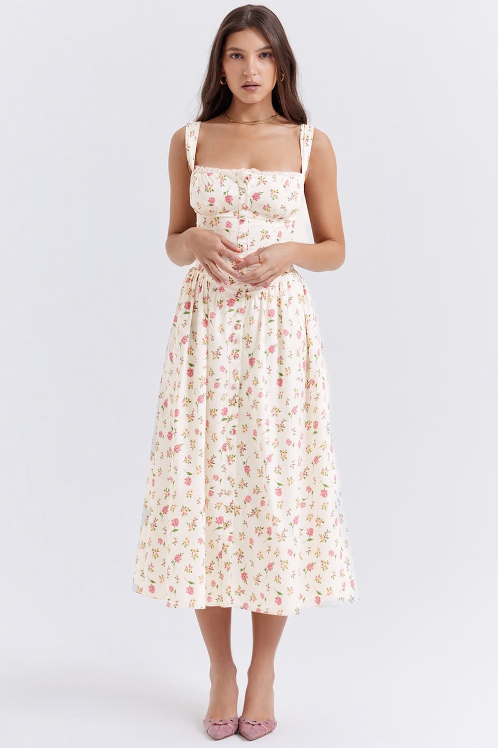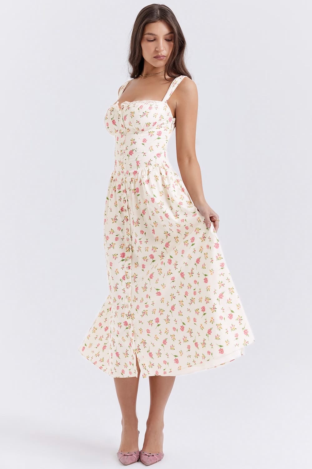Desperte sua essência mais feminina e romântica com nosso encantador vestido midi floral que combina bustier ajustado, estampa de micro flores delicadas e fileira de botões funcionais para criar o equilíbrio perfeito entre doçura vintage e praticidade moderna.