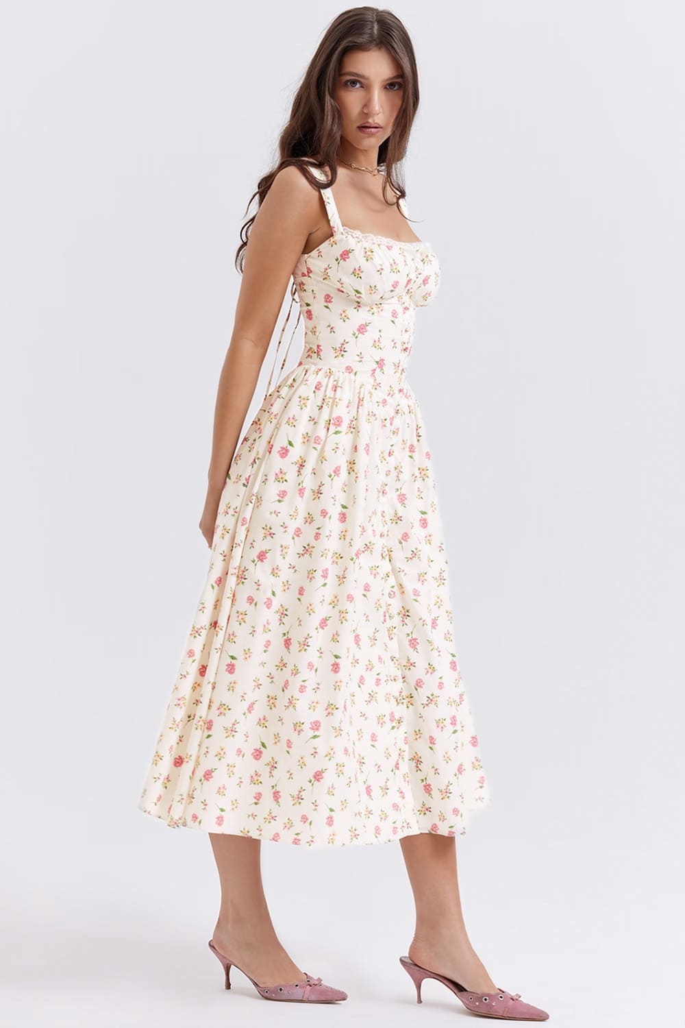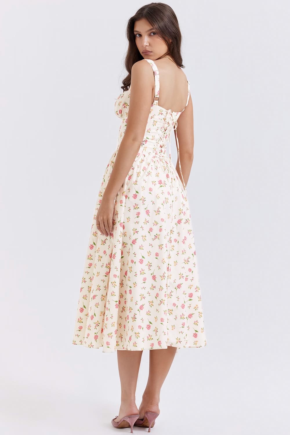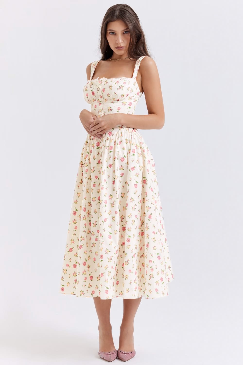 Desperte sua essência mais feminina e romântica com nosso encantador vestido midi floral que combina bustier ajustado, estampa de micro flores delicadas e fileira de botões funcionais para criar o equilíbrio perfeito entre doçura vintage e praticidade moderna.