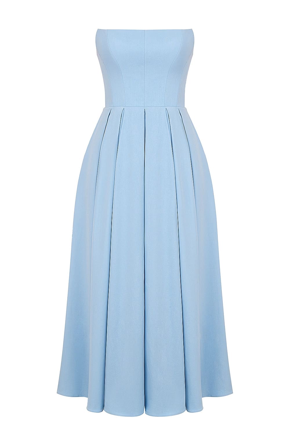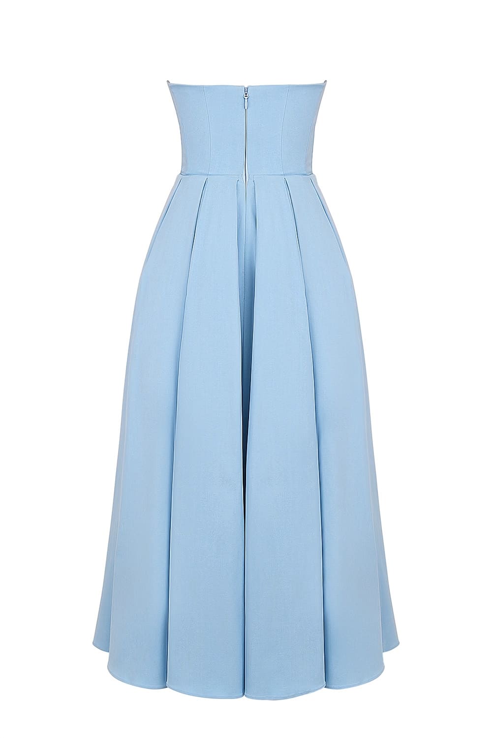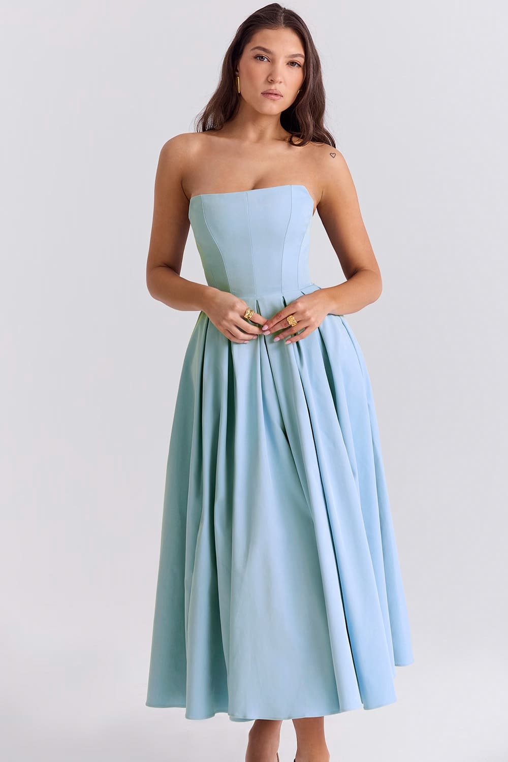 Deslumbre com nosso sofisticado vestido rodado azul tomara que caia midi de linhas impecáveis. O design minimalista e elegante com busto estruturado e saia evasê cria uma silhueta clássica e feminina, perfeita para mulheres que valorizam a elegância discreta e atemporal.